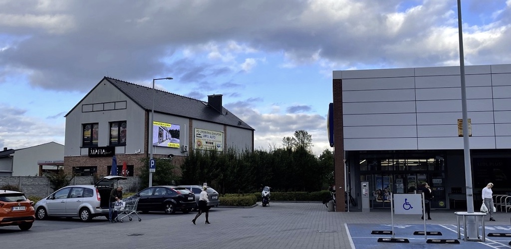 - Zlokalizowany tuż przy wjeździe na duży, ogólnodostępny parking sklepu, ekran zapewnia doskonałą widoczność zarówno dla klientów Lidla, jak i dla przejeżdżających kierowców oraz przechodniów korzystających z infrastruktury okolicy.