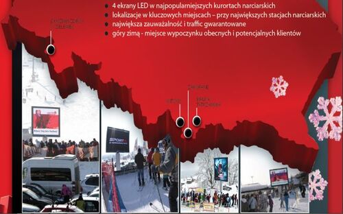 Ekrany led w kurortach i na stokach narciarskich: Zakopane Witów, Białka Tatrzańska, Suche SKI, Jaworzyna Krynicka, Zieleniec