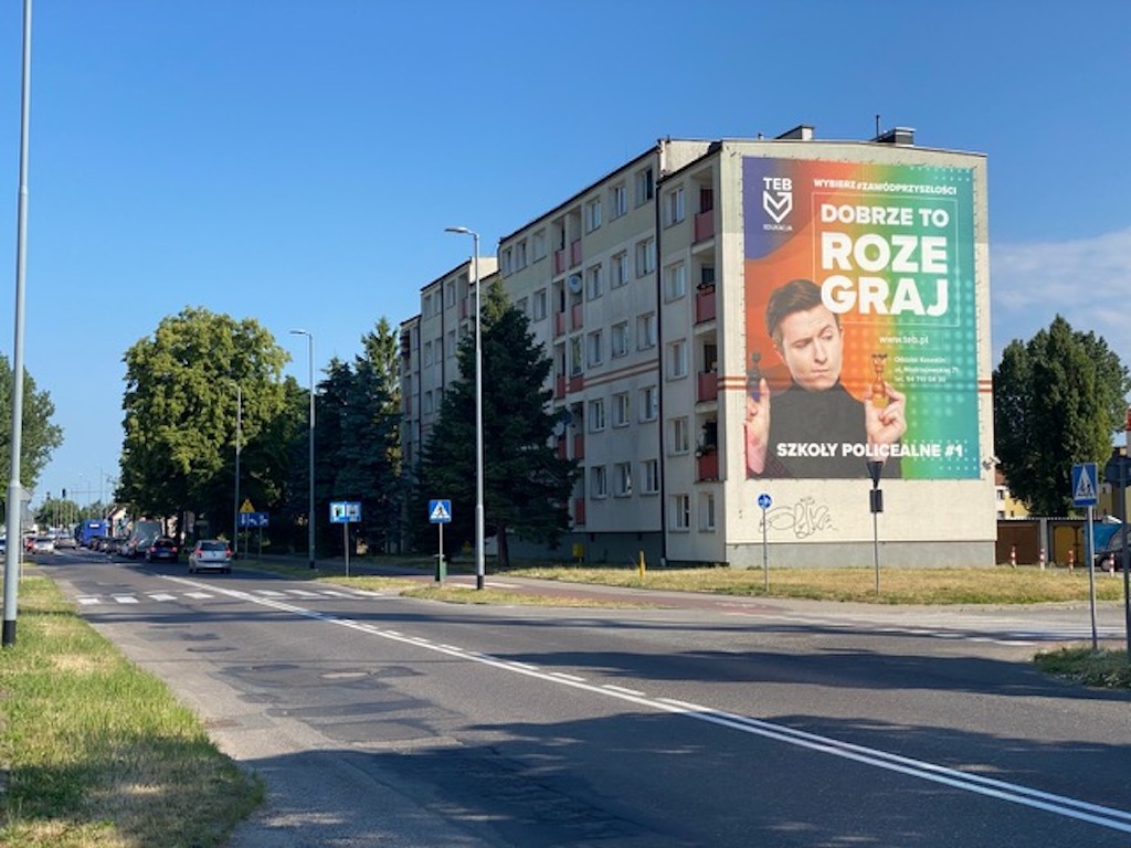Ściana budynku zlokalizowana przy tym adresie oferuje bardzo dobrą ekspozycję reklamy wielkoformatowej. Nośnik znajduje się w naturalnym polu widzenia kierowców i pasażerów, a charakter ruchu (skrzyżowania, spowolnienia, dojazdy do obiektów handlowo-usługowych) wydłuża czas kontaktu wzrokowego z przekazem. Dzięki temu reklama nie jest jedynie krótkim impulsem, lecz czytelnym i zapamiętywalnym komunikatem.