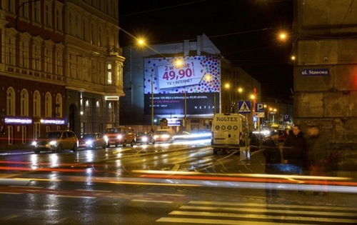 Bezpośredni najazd na reklamę od Dworca PKP w kierunku ul. Świdnickiej i Rynku