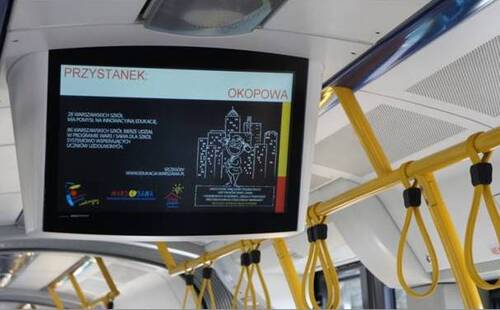 Reklama na monitorach LCD w pojazdach ZTM -Tramwaje Warszawskie.