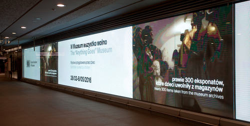 Multimedialny ekran na stacji Metro Świętokrzyska składający się z trzech wielkich ekranów, prezentowanych na trzech ścianach stacji metra.