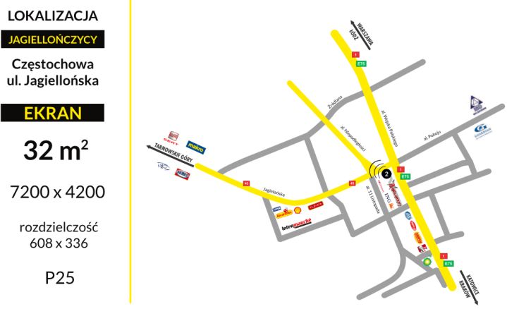 - Ekran znajduje się w miejscu o dużym natężeniu ruchu, naprzeciwko cmentarza św. Rocha, przy przebiegu głównych dróg tranzytowych do miast takich jak: Warszawa, Katowice, Opole, Wieluń, DK 46