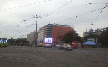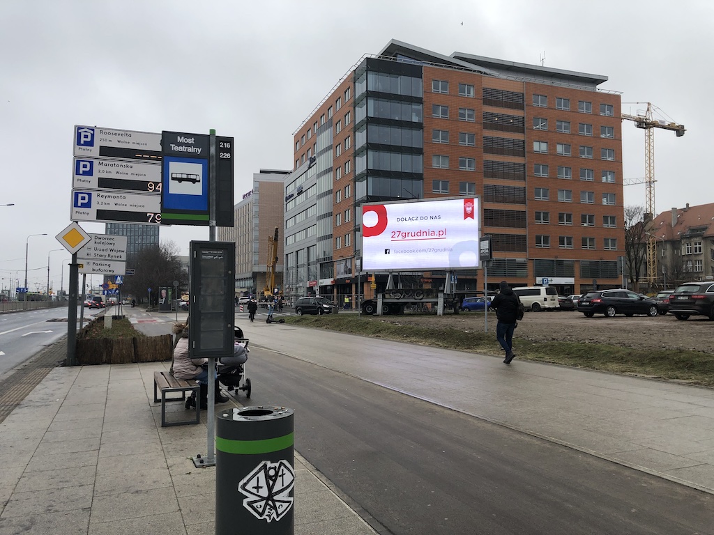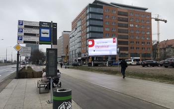 - Ekran led w centrum Poznania na rogu ulic Roosevelta i Dąbrowskiego, w pobliżu Mostu Teatralnego i Ronda Kaponiera